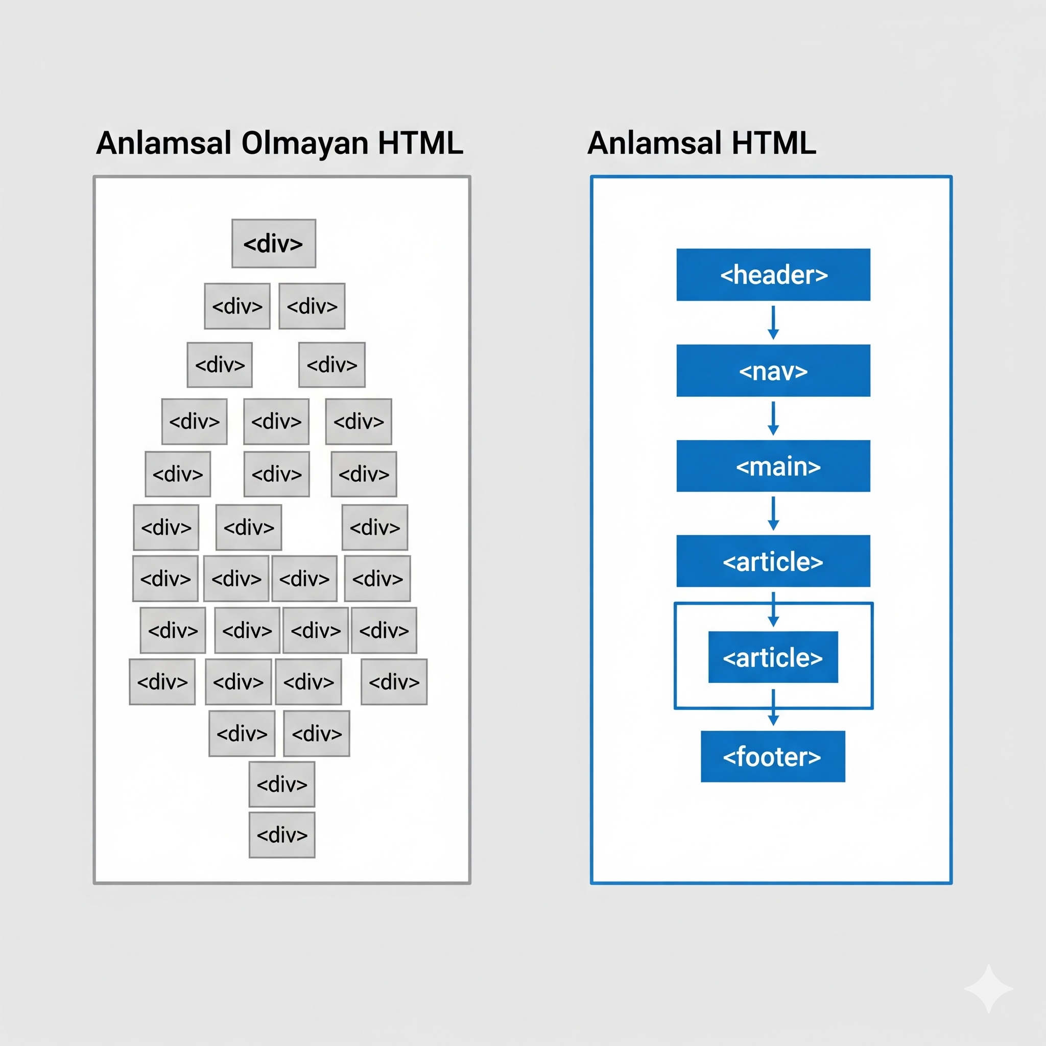 getirir. Buna karşılık, anlamsal HTML etiketleri (header, nav, main,
